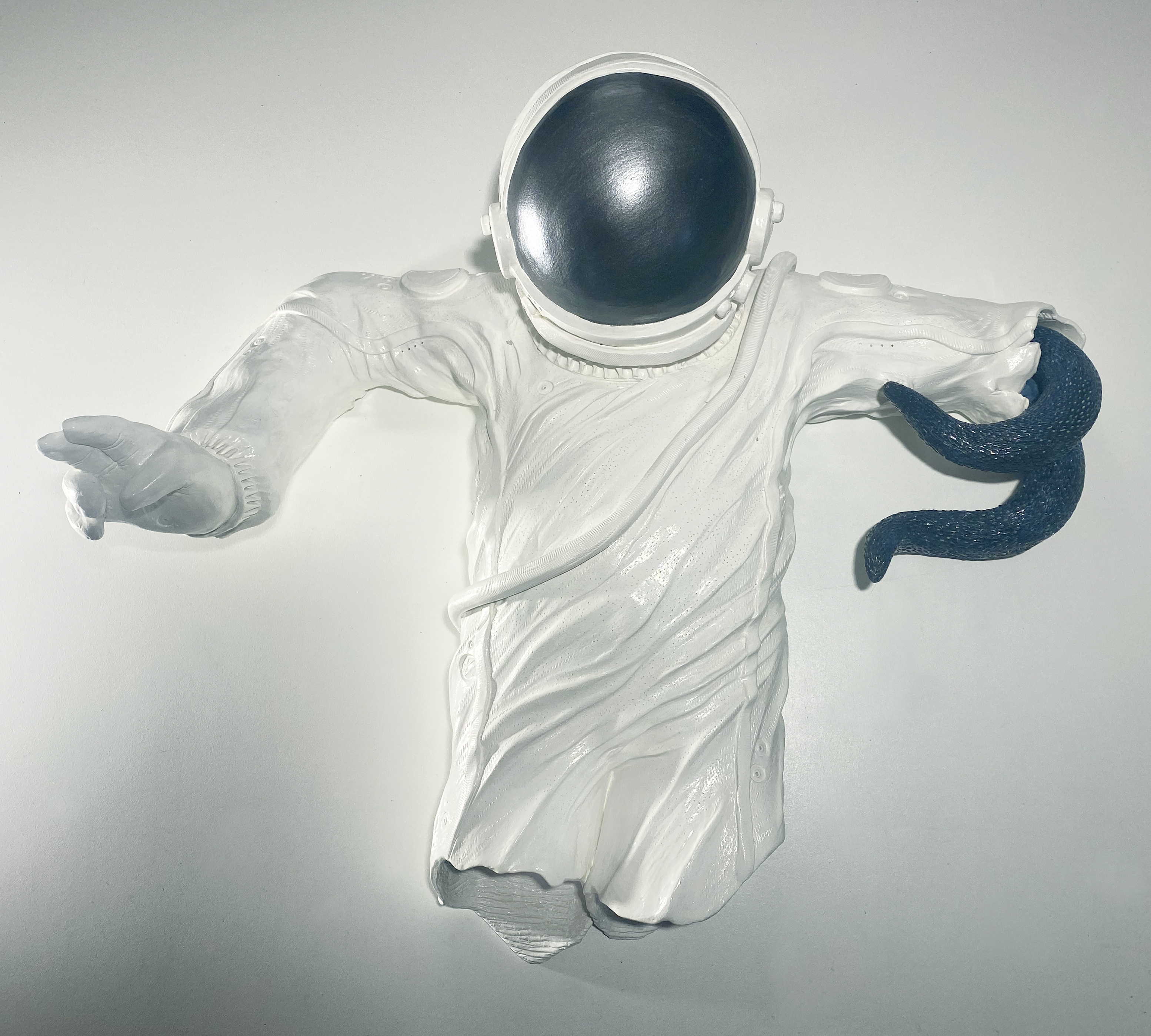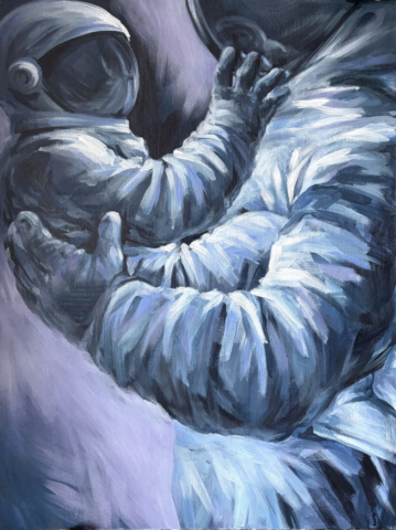 He floats in the silence of the possible, surrounded by the residue of human achievement, carrying with him the weight of memory. His suit is a fragile boundary between mortality and the indifferent vacuum beyond, yet within that membrane, all of humanity’s inventions converge: technology, biology, art, mathematics, and faith.